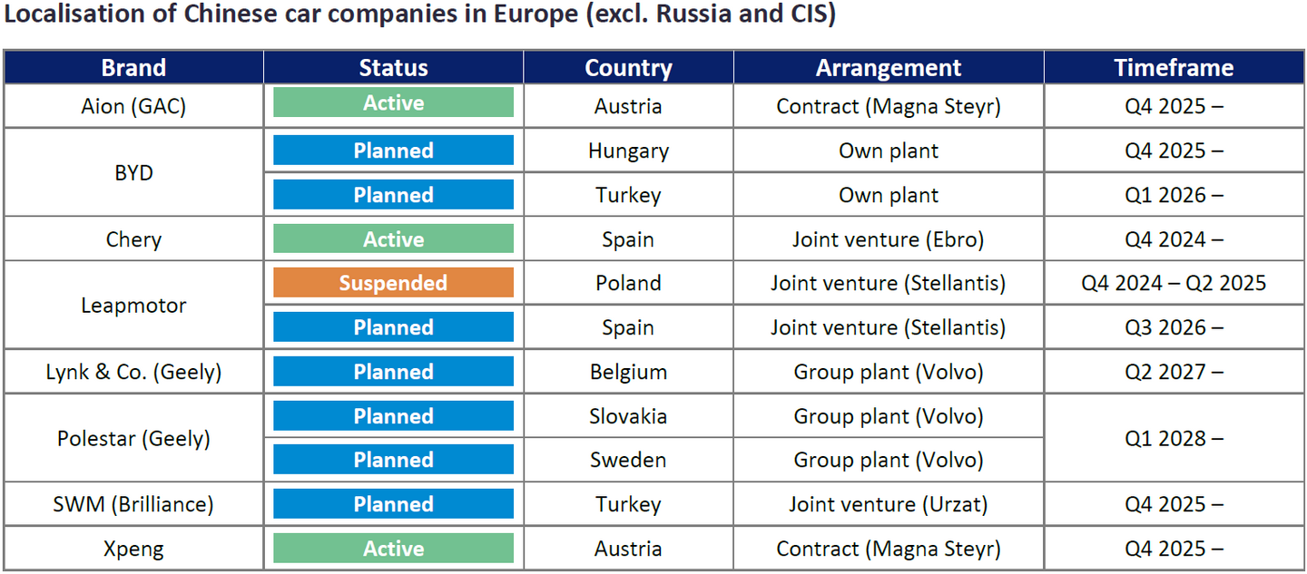 For European contract manufacturers, the arrival of smaller Chinese OEMs offers a crucial lifeline. Magna Steyr’s new contracts with GAC and Xpeng will help offset its loss of business with established European players. Valmet Automotive, meanwhile, has faced reduced order volumes and a change in ownership structure, with CATL exiting and the Finnish state stepping in as a shareholder. VDL Nedcar has also faced contract losses from BMW and remains under pressure to secure long-term agreements, having ended large-scale vehicle assembly in early 2024 and partially transitioned to mobility solutions and defense. For Magna Steyr and Valmet, at least, partnering with Chinese automakers represents a way to continue operating as car producers, even as their traditional clientele reduces its reliance on outsourced manufacturing.