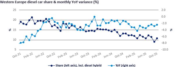 It is perhaps a long tail of decline, but diesel car sales in Western Europe are continuing a trend decline – they are now around 10% of the overall car market - that will continue in 2026 as buyers move to electrified vehicles. They won’t disappear entirely for a few more years yet. For one thing, they still play a big part in the powertrains of light commercial vehicles (LCVs) and some OEMs will continue to find niche car demand for diesels that they are producing. Diesels remain popular as towing cars (not a strength of BEVs) while also being seen as long-lasting, affordable to maintain and frugal on fuel. Over time there has been a demise of small diesel engines with a greater concentration around the 2.0L displacement area. Diesel cars in Europe: going but not gone.