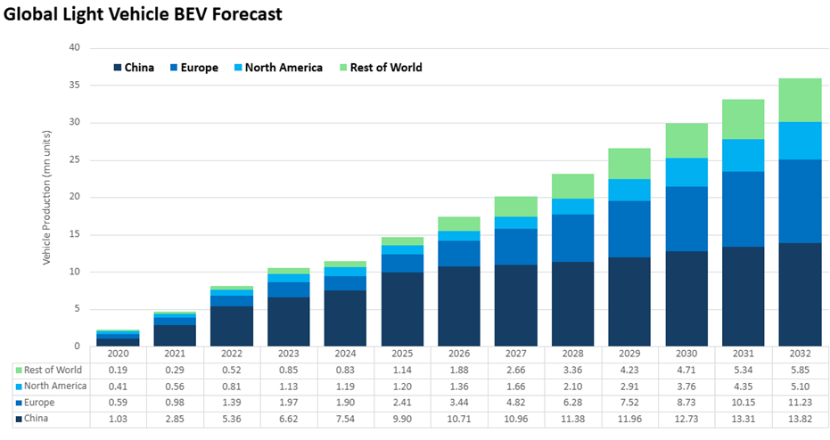 The direction of travel in the world’s auto industry has been set: Battery Electric Vehicles (BEVs) are growing volume and share, led by buoyant sales in China (where public scrappage incentives and a price war have played an important part). Light vehicle BEV sales across the world are forecast at 14.7 million units in 2025, rising to 17.4 million units in 2026. Europe is also seeing rapid growth, but the US has plateaued (see below) after tax incentives for BEVs ended.